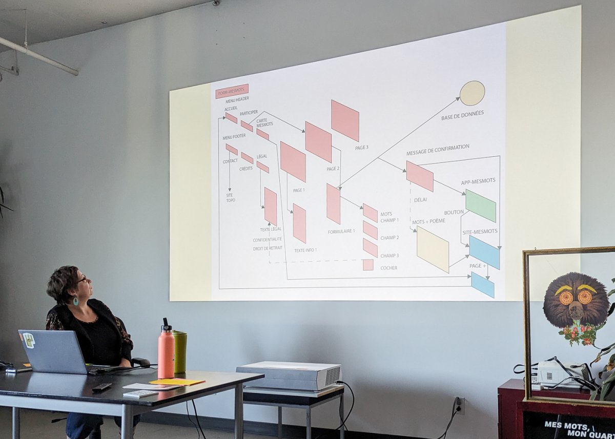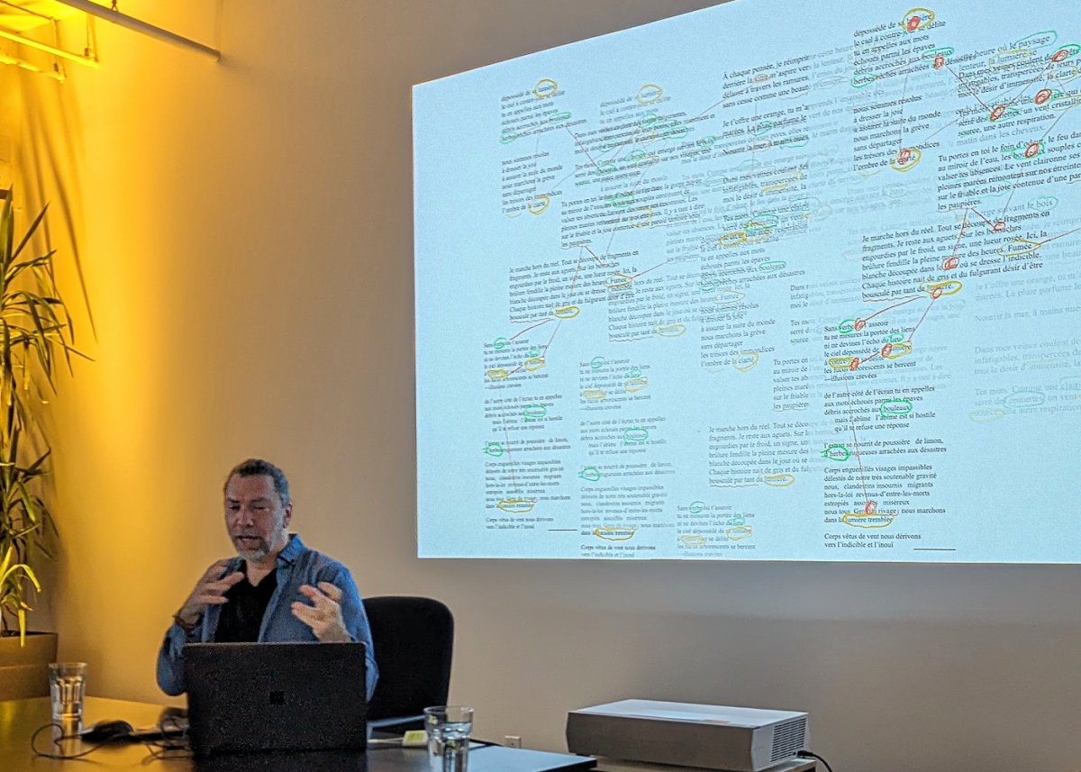 Photographe et artiste numérique, Jean-Sébastien Veilleux témoignera d’une expérience complexe de mise en espace du texte et du processus de collaboration avec leurs auteures pour le projet Stellaires, une installation intégrant photo, poésie et vidéo mapping présentée au centre GO, à Saint-Jean-Port-Joli, en 2022, dans le cadre du Mois de la poésie. Le projet nécessitait l’habillage d’une alcôve de projection pour la mise en espace interactive du texte des poètes Catherine Fortin et Dominique Zalitis.
