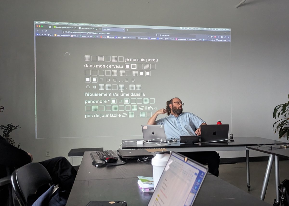 Yan St-Onge est artiste intermédia, poète, performeur, sémioticien et wikipédiste. Fort de sa pratique d’écriture multidisciplinaire, il présentera quelques-uns de ses projets ainsi que « Flottement. Vanitas intermédia », une œuvre en cours de création avec le logiciel Twine qui intègre écriture, photo, dessin, poésie visuelle, vidéo & performance. L’auteur expérimente aussi afin d’insérer l’intelligence artificielle dans le processus.